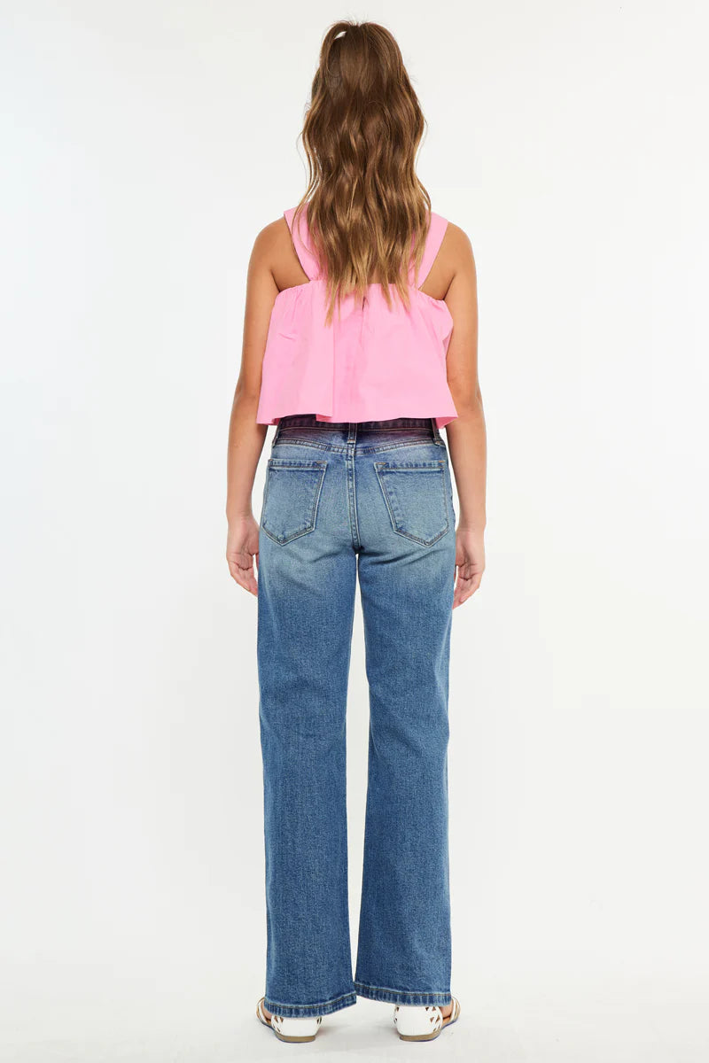 Celine High Rise Kids 90's Flare Jeans a trendy silhouette perfect for playdates or casual outings. Contrasting details around the front pockets allowing the jean to stand out. Made from a soft denim fabric that offers comfort without losing its shape. An exposed button-fly, regular hem, 5-pocket style.