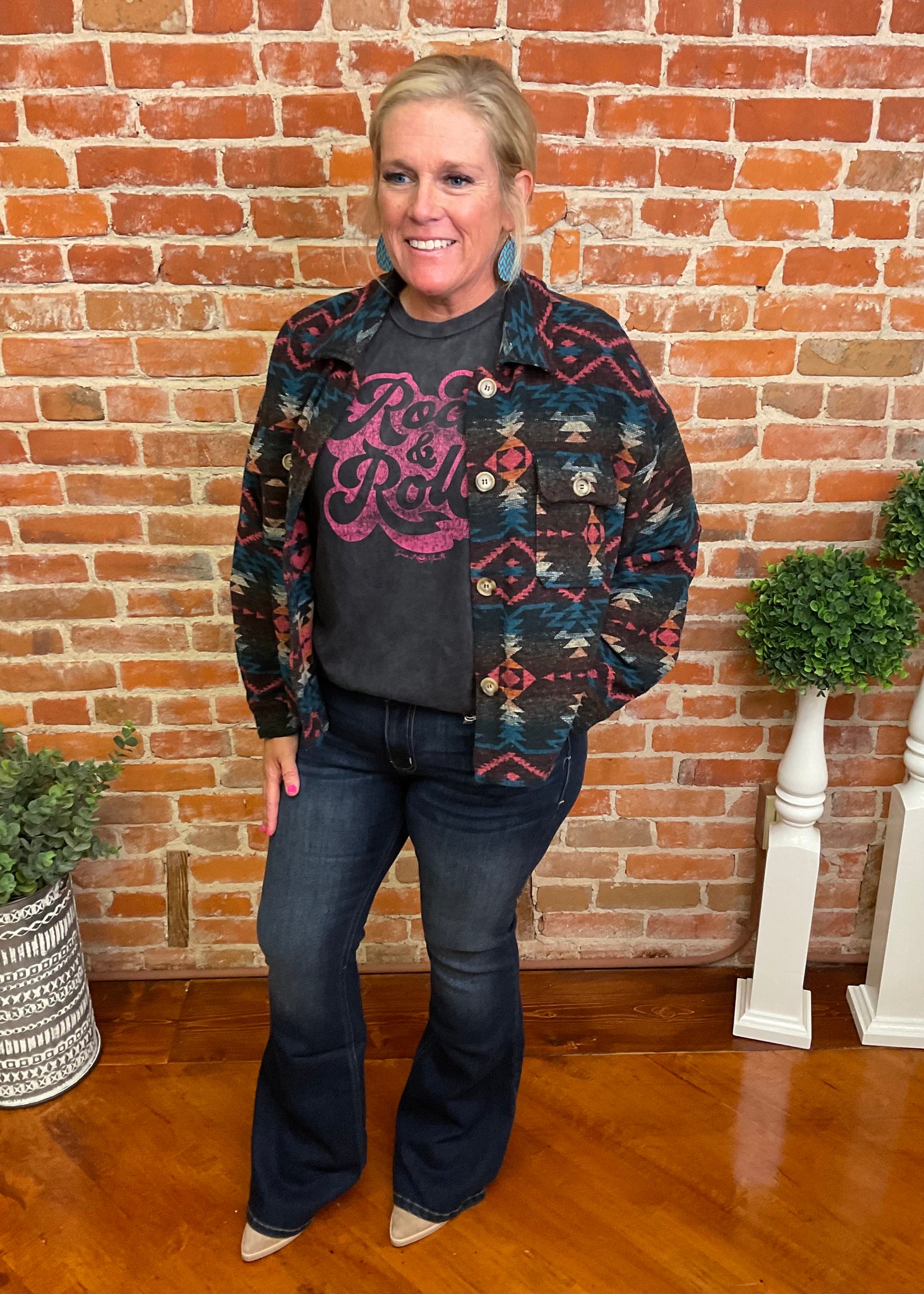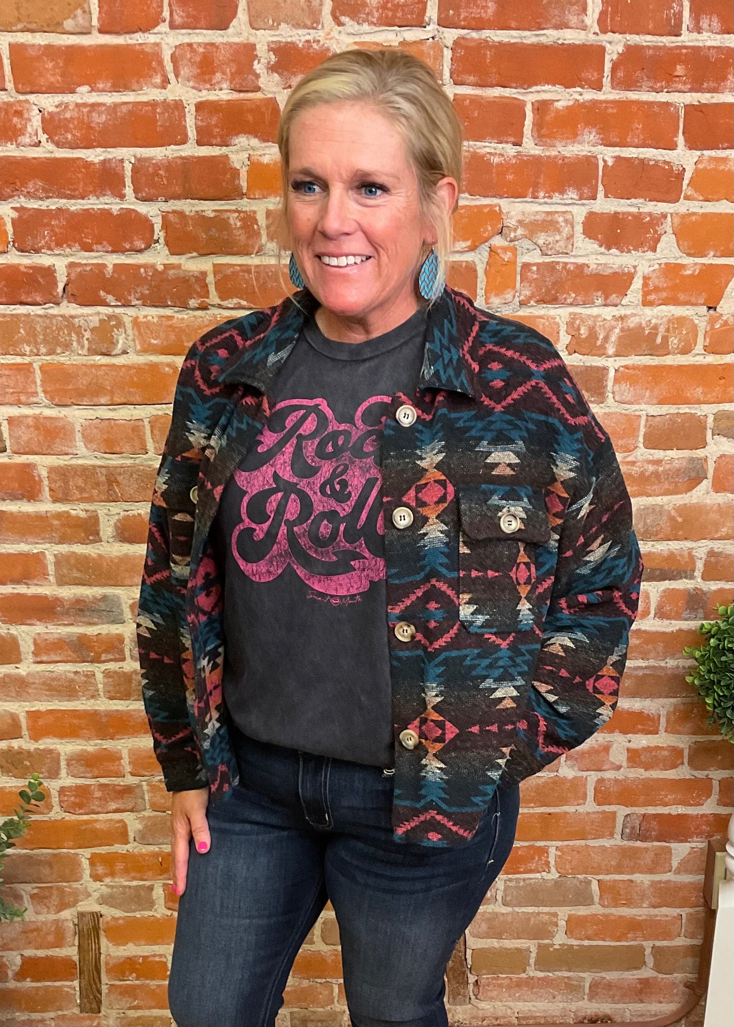 Multi color, Aztec print jacket featuring double chest pockets and button closure.
