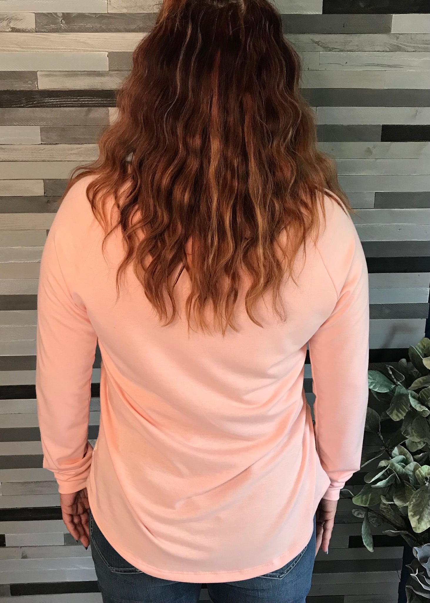 Long-sleeved top. Fits true to size. Front panel is like lightweight sweater material.