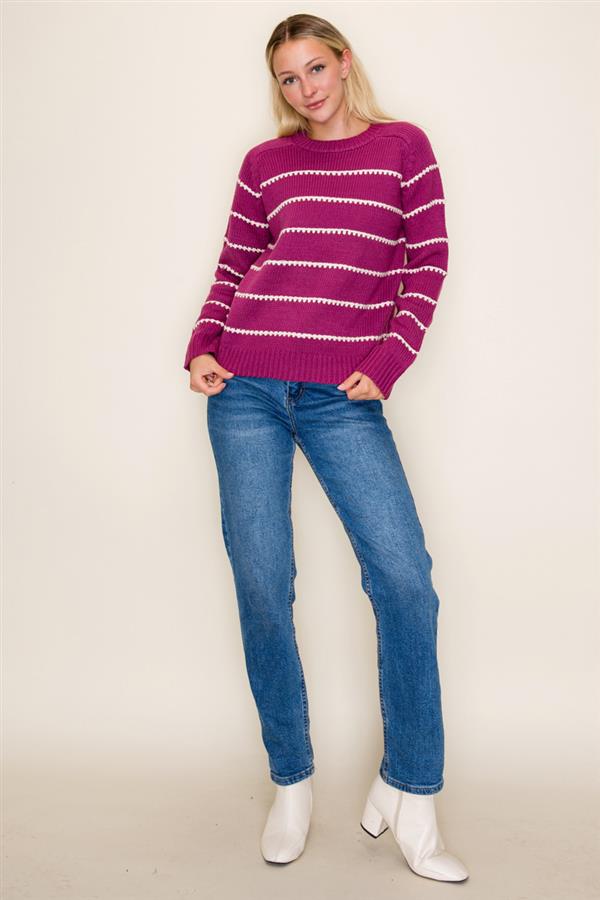 Dark magenta, crewneck pullover sweater featuring blanket stitch stripes.