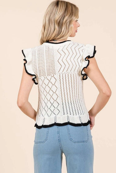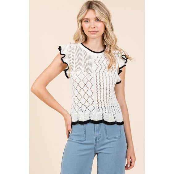 Ivory, round neck, sweater knit top featuring multi pattern detail, a scallop hem, and contrast piping trim details.