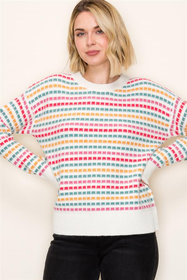Long sleeve, crew neck sweater featuring multi color texture stipes.